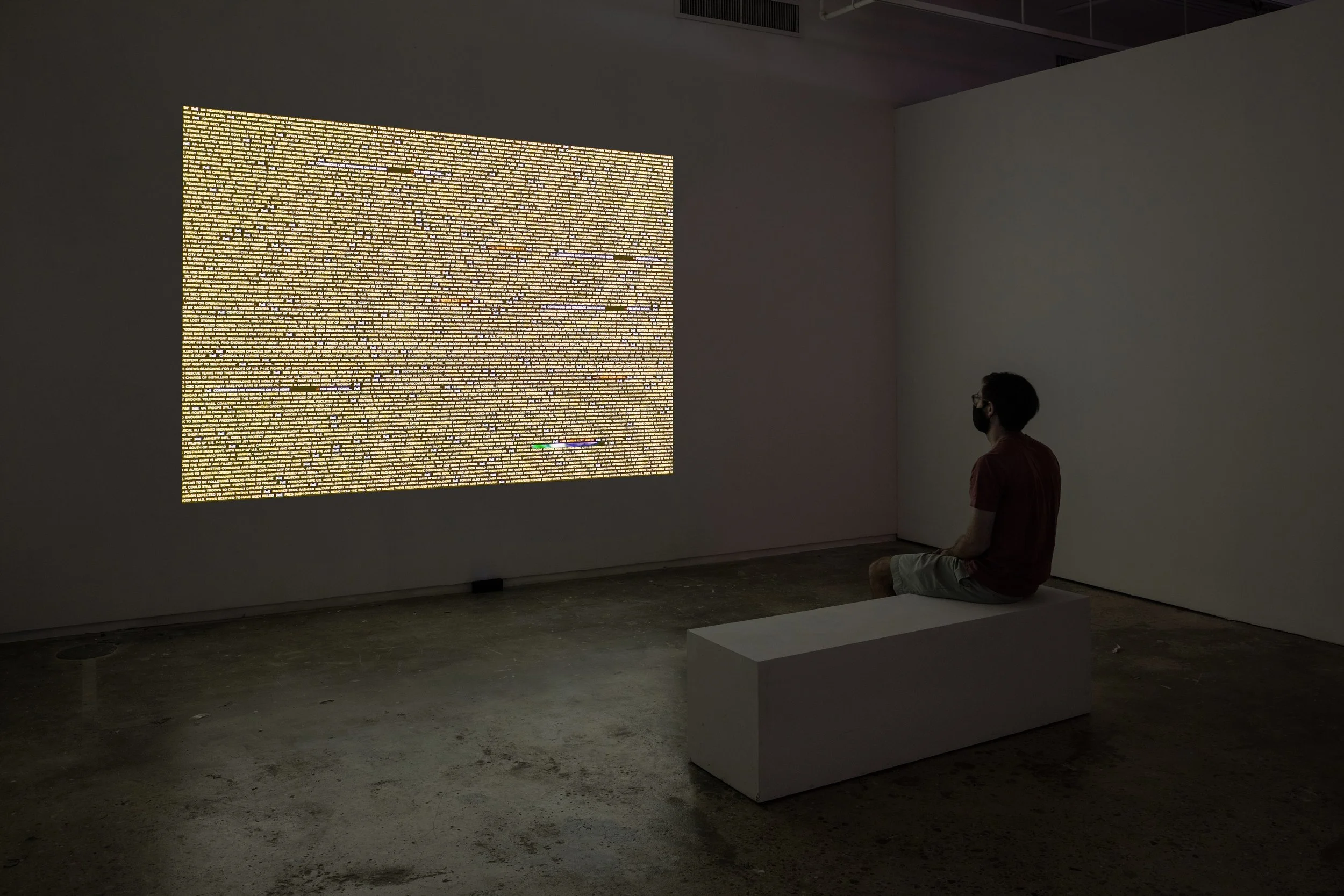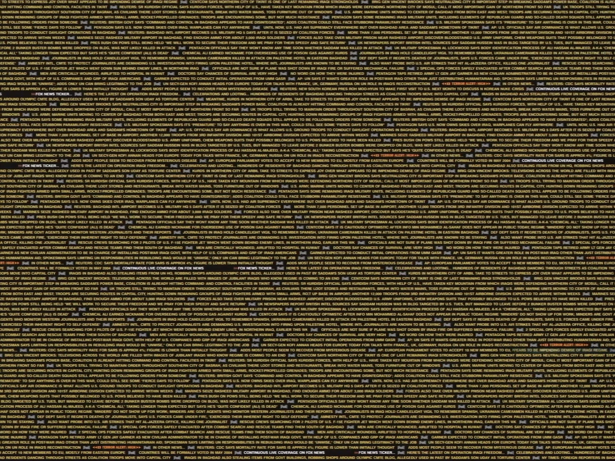 Today’s News: April 9, 2003 chronologically aggregates the news tickers that ran along the bottom of cable news broadcasts (CNN, MSNBC, and Fox News) on April 9, 2003 when U.S. troops infamously toppled a statue of Saddam Hussein in Baghdad. Each headline enters at the bottom right corner and scrolls continuously on screen for 50 minutes as it snakes up 90 rows of text before exiting at the top left corner of the screen. The sporadic flashes that break up the flow of text mark transitions from one channel to another arising from the VHS recordings that served as this video’s source material. The sound results from layering up the soundtracks from each of the 540 videos that compose the overall mosaic. In addition to headlines about the Iraq War, viewers may also notice reporting on the 2003 SARS outbreak.